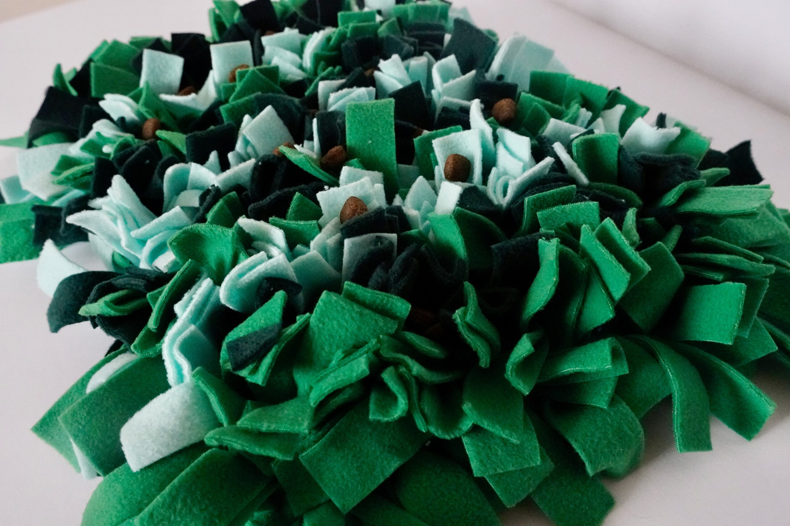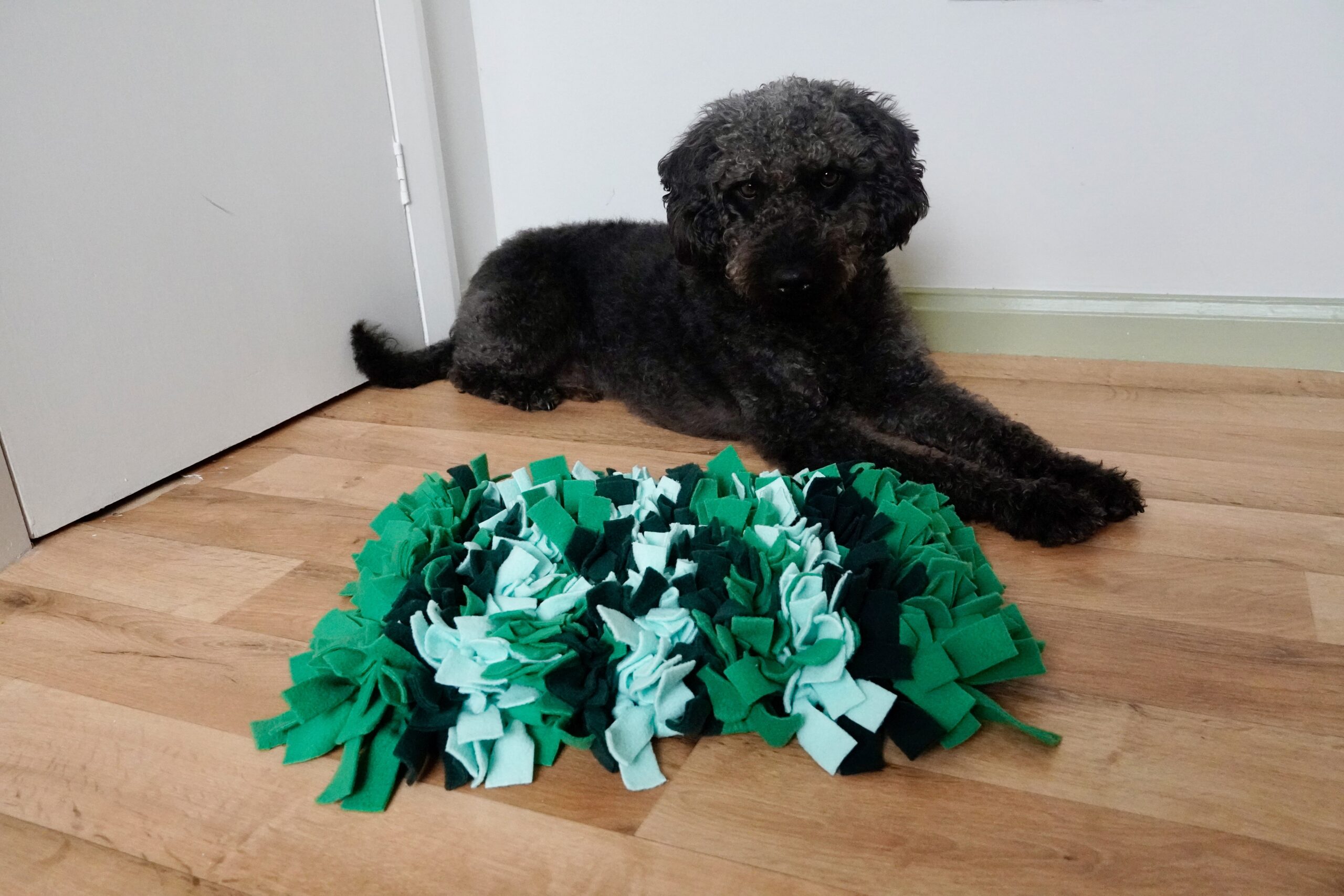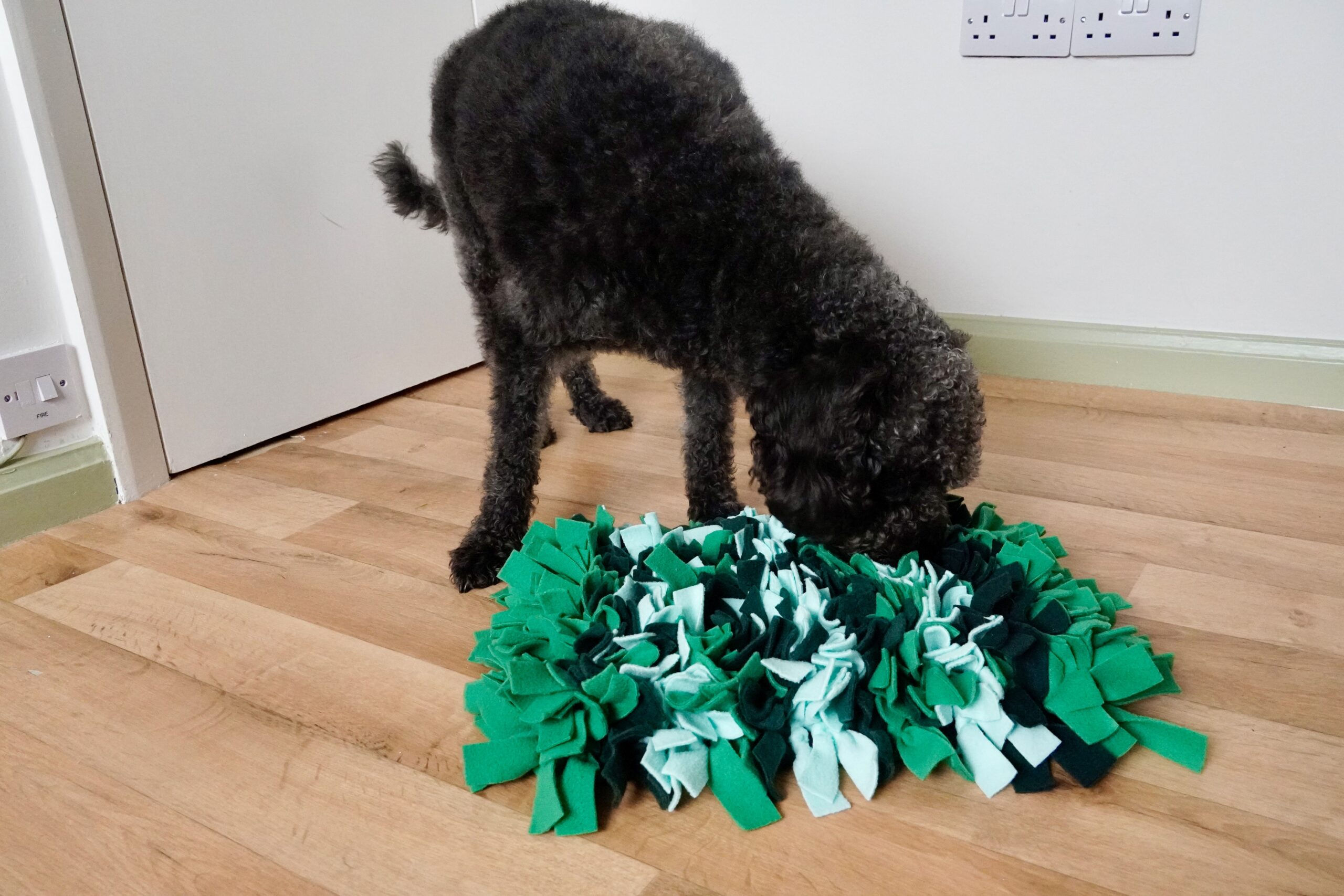 - It is important to lift the snuffle mat off the floor after your dog has eaten all the treats as this helps to promote sniffing and not chewing or playing with the snuffle mat.